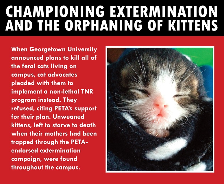 The law would have been simple. Senate Bill 359, a bill pending in the Virginia legislature in 2012, would have clarified that neutering and releasing feral cats back to their habitats was not illegal, allowing cat advocates to continue doing so without fear of prosecution. But PETA successfully led the effort to oppose the law, joining kill shelters throughout the state and the Virginia Animal Control Association in defeating it.